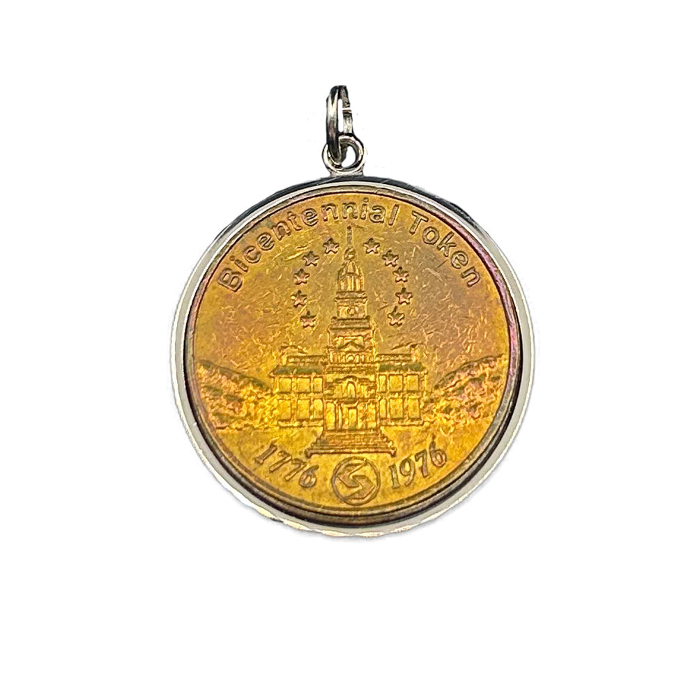 Elevate your accessories with this distinctive Bicentennial Token Pendant. Transformed from an authentic vintage token into an elegant wearable piece, this pendant showcases historical artistry with sophisticated charm. The pendant comes without a chain, allowing you to pair it with your preferred necklace style for a personalized statement. A refined conversation piece for collectors and fashion connoisseurs alike.